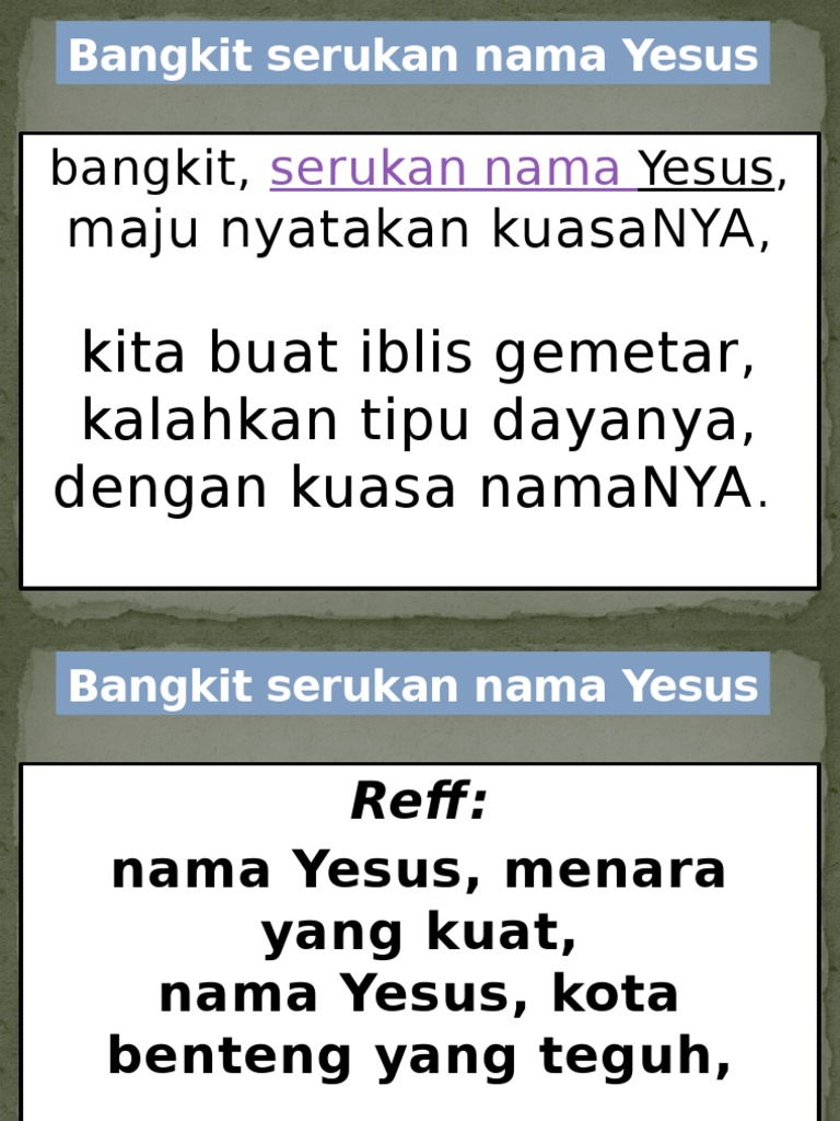 Nama Yesus kota benteng yang teguh. Silakan menghubungi kami. Bangkit serukan nama yesus maju nyatakan kuasa-nya kita buat iblis gemetar kalahkan tipu dayanya dengan kuasa nama-nya.